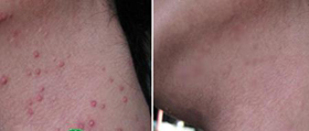 毛囊炎治疗两个疗程后:皮肤丘疹、脓包逐渐萎缩消失,破损的疹包开始愈合。